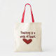 Handla väskan för en favoritlärare med text- och hjärtgrafik som säger "Att lära är ett hjärtearbete". Snygg läraruppskattning i slutet av ett skolår eller någon annan tid. Skapat med inköpet licensierat klipp av Alice Smith från Clipart4Resale.