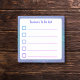 Läraren som ska göra listigt anteckningsblock kan vara personlig med lärarens namn. Det är ett litet fyrkantigt anteckningsblock med 3 x 3 klibbiga punkter med skuggor av blått och lila på vit bakgrund. Det finns en pseudo sparsam lila och blå gräns. Du kan ändra texten som säger "Att göra lista" till någon annan typ av lista om du vill. Det finns kryssrutor bredvid vart och ett av 5 linjer som kan kryssas för när varje uppgift är klar. Behålla det enkelt med bara 5 sak att göra!