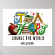 Kreativ och färgrik lärare-tematisk design med skolrelaterade element som böcker, glob, linjal och äpple som formar ordet ”Lärare”, med den inspirerande frasen ”Förändra Världen”.