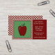 Denna visitkort är perfekt för någon lärare. Den presenterar ett rött äpple på vänster sida på en grön bakgrund som omges av en vit och en röd kontrollerad gräns. Informationen om lärare är på rätsidan med en röd bakgrund.