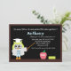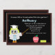 Vem ska ta examen??? Denna inbjudan är perfekt för en förskola eller förskoleklass som ska ta examen. Den har svart mitt med en brun kant runt om. Det är en svart tavla från ett klassrum. Det finns ett äpple och en radergummi längs med nederkanten. Det finns en söt vis owl som bär en mössa på vänster sida av denna inbjudan. Ugglan håller en pekare i sin hand. Anpassa med festinformation och du är redo att gå. Kolla in våra många andra mönster och tryck i vår butik. ©babystar