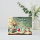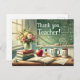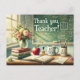 Här är ditt vykort för Lärarveckan i akvarellstil! 🎨📚 Bilden visar en gammal svart tavla med elegant vit kalligrafi som lyder "Tack, lärare!", tillsammans med klassiska äpplen och bok-element i en mysig klassrumsmiljö.