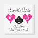 Las vegas bröllop spara datum magnet med nybörjare rosa hjärtan. Personligens monogramdesign med initialer av brud och groom plus datum för giftermål. Monogrammed Kung och hjärtdrottning. Poker spelar kort kostym, hjärtan och spader.