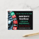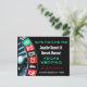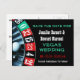Roligt "Save the Date" meddelande för ett kasino i Las Vegas bröllop, gjort på ett vykort för enklare utskick. Framsidan av kortet är gjort i svart, med ett roulettehjul som visas på vänster sida, med den vita kulan som pekar på ett anpassat vitt nummer. Grön, röd och vit ytterligare text, på höger sida av kortet, och två svarta textfält finns på baksidan. Anpassa numret på hjulet till din bröllopsdag och resten av texten med din bröllopsinformation. Bra bröllopsmeddelande för alla bröllop som äger rum i en kasinospelstad.