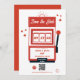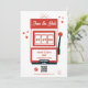 Ett unikt hand plockade Las Vegas Casino-temat bröllop-design. Ett modernt tema i Las Vegas, Nevada bröllop med spelkort, kasinospelets temaillustrationer. Ett rött och vitt Las Vegas bröllop spara datum-kort som passar perfekt för kasinokemat bröllop. Det finns också möjlighet att matcha bröllopsinbjudningar och andra artiklar i kontorsartiklar.