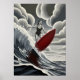 En monumental Art Deco-oljemålning från ett dramatiskt mask-öga-perspektiv, som skildrar en mäktig kvinnlig surfare i en monokromatisk gråvärld, hennes skulpturform som definieras av extrem kiaroscuro-belysning när hon rider en livfull krimson-surfboard.