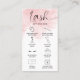Se till att dina klienter vet hur de ska ta hand om sina fingerade ögonfransar med det här affärskortet för eftervård. Kortet för vårdinstruktioner för lårbenstillägg innehåller vårdikoner för varje steg, rosa av vattenfärgsbakgrund och skriptteckensnitt för elegant av elegant samt utrymme för logotyp av salon och kontaktuppgifter. Det här trendigets skönhetshandläggningskort är perfekten som tillägg till din utformning av salongförråd.