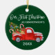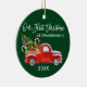 Modern Brush Script Vår första jul som mor- och farföräldrar Ornament inkluderar Vattenfärg Vintage Röd lastbil med julgran, Snö, Julpresenter och Godisstavar. Skoggrön bakgrund.