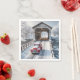 En röd vintage lastbil kör över en bron som täcks av snö och som omges av ett väderlandskap