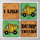 Fyra fyrkanter med en lastbil-tecknad och ord "Jag gillar Lastbil!"