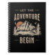 Retro stil-glasillustration med texten "Låt äventyr börja", solnedgång, berg och fåglars dekoration för alla som tycker om natur och vandring