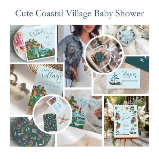 Denna förtjusande utformning av byarna vid sommarkusten präglas av fiskmås och små segelbåtar. Underbar för en könsneutral dusch med temat "det tar en by". Teckensnitt färg kan anpassas. Du kan flytta fiskmås och ändra storlek på eller ta bort dem. Originalteckningar av Caroline Bonne Müller.