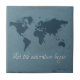 Låt äventyr börja textdesignen med världskarta dekoration på grym, blå bakgrund