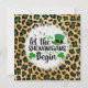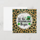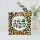 Den här högtidskortet fångar St. Patricks-dagens livliga anda med en blandning av traditionella och djärva element. Bakgrunden är ett leopardtrycksmönster med svarta och gröna glitterpunkter på en gul-guldfärgad botten. I mitten skapar ett vitt cirkulärt område med en något urblekt kant en spotlight-effekt på texten och grafiken inom den. Den lekfulla och djärva svarta texten lyder "let the SHENANIGANS Begin". Runt texten finns charmiga St. Patricks-dagsymboler: en grön lilleputtehatt med svart band och guldbrosch, två gröna shamrockar och några mindre gröna klöverblad. Kombinationen av det vilda leopardtrycket och de festliga St. Patricks-dagsikonerna gör detta kort livfullt