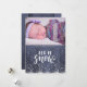 Modern rustic blågrå brädgolv och vit jul / vinter semestern anpassad kort med elegant borstad script typografi och fallande snö. Anpassa den med ditt familjefoto (horisontell / liggande orienterad) och med din signatur / text!