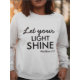 Den här strålande kvinnans tröja, inspirerad av den mäktiga skript Matthew 5:16. Med det upplyftande budskapet "Låt ljuset skina" fick du inspiration och upplyft. När du bäror den här tröjan, låt den bli en hoppets ledstjärna som reflekterar kärlek och godhet Gud. Ljuset lyser mycket, lyser liv och inspirerar andra att gå i tro.
