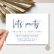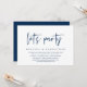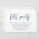 Modern marinblå script-tema, bröllopsinbjudningskort för flykt (Låt oss festa). Det är perfekt för din bröllopsflykt, avslappnad sjöbröllopsmiddag, dans och fest.