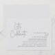 Meddela elegant ditt lyckliga slut med vår moderna och klassiska bröllopsinbjudan för intimt firande av vigsel och mottagning med korttiteln "Låt oss fira". Skräddarsydd för par som fortsätter sin kärlekshistoria, hittar denna inbjudan en perfekt balans mellan sofistikation och charm och sätter tonen för en oförytterlig kväll. Med en modern samtida typsnittsdesign med mörkgrå text på kyliggrå bakgrund tillför den en tidlös elegans till er speciella dag, och denna inbjudan är ett stilrent uttryck för er varaktiga kärlek. Denna inbjudan kan modifieras för att passa era behov för bröllopsbrunch, lunch, middag eller fest.