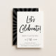 Modern manus Låt oss Firate!, födelsedagsfest inbjudan. Modellen Svart typografi är stil. På baksidan av kortet finns coola sunburst mönster för att samordna svart och grått färger.