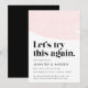 Behöver du skjuta upp eller ändra ditt bröllopsdatum? Informera bröllopsgäster med vårt trendiga och moderna bröllopsuppskjutande meddelande. Chic design med en rosa akvarelldesign högst upp med "Låt oss försöka igen" i en stilren, fet svart stil. Anpassa tillkännagivandet genom att lägga till era namn, bröllopsdetaljer och bröllopswebbplats.