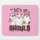 Tum och häxa Halloween-design på T-shirts, mugg, påsar, kuddar, knappar och mer har tre konstiga Halloween-ghouls med djävulen-horn och häxhattar, fladdermus, blommor, jack o lantern-pumpa och text som säger Låt oss Go Ghouls!
