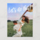 En avslappnad spara-datum-kort tryckt med ett stort foto av det lyckliga paret. Låt oss göra detta! skrivs överst i ett charmigt vitt handskriftskrift.