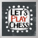 "Låt oss Spela upp schack" är en söt textdesign i grått med svart och röd text, tillsammans med en vit accentform och vita texturerade vita punkter som omger den.