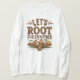 Minnesvänlighet och gemenskap med denna rustiska t-shirt-design med texten "LÅT OSS ROOT FOR VARANDRA" i ett charmerande, handritat teckensnitt. Illustrerade morötter, lök och potatis tillför en lekfull beröring som ställs mot en beige träbrädesbakgrund. Perfekt för att sprida positivitet och hälsosamma vibes i stil!