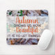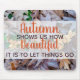 Den här musmattan har ett vackert bild av fallna löv med små svampar av gult bland gröntens gräs. Anpassadet heter "Hösten visar oss hur vackert det är att låta sak gå"