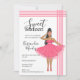 Pink Latina Babe modeillustration söta 16-års inbjudan. Teckningen visar henne i en vacker rosa klänning med broderade detaljer. Hon har också rosa solglasögon och skor. Söt modeillustration för den feminina girltypen. Ett sött illustrations inbjudningskort som hela din familj och vänner kommer att älska.