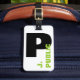 En knaprig vitbakgrund med ett stort svart brev för din initiala och mindre text i ljust - göra grön för ditt namn, information om kontakt är på baksidaen.