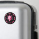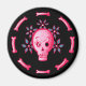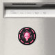 En märklig skallmagnet med en digital illustration som skildrar ett rosa skalle med ögonfransar som tittar ihop med att lycklig mask kommer ut ur sitt öga-socket, blommor som ligger bakom det och ben runt det. Underbar för Halloween och gothic stil med en känsla av humor.