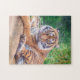 Stäng ett foto av en kyld tiger-relaxering på trä med gröntens löv bakom.