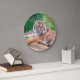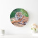 Stäng ett foto av en kyld tiger-relaxering på trä med gröntens löv bakom.