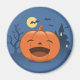 Underbart skrattande Halloween-pumpa. En död träd, en läskig mansion, några fladdermöss och måne ses i bakgrunden.