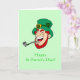 Perfekt för St patrick's day! En skrattleprechaun med ingefärgskägg, lerrör och schamprock i hans hatband. Verse inuti lyder: En Lycklig St. Patrick's day åt dig, och alla folk som du håller högt. Må schamprock's tur hålla rak och sann och le på dig i ytterligare ett år