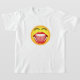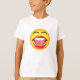 © Sunny Mars Design. Ansikte Emoji T-Shirts - coolan, humorismen, roligten, är en lustig illustration av en gult som skrattar åt ansikte emoticon emoji med stor mun, ljusa vita pärltänder, tunga och stängt ögon. Koncept för humor.