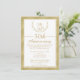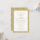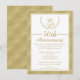Denna inbjudan till 50-års bröllopsjubileum har en falsk lagerkrans och kant i guld. Paret initialer visas i lagerkransen högst upp på inbjudan. Textområdet är vitt med en guldbord och avdelare. Kanten på framsidan av inbjudan och baksidan av inbjudan har en falsk guld bakgrund med ett diamantliknande mönster. Denna 50-års lagerkrans och falska guld inbjudan är redo att anpassas.