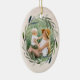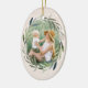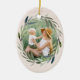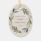 Elegant dubbla sidosatte fotoornament ramar ett favoritfoto med en ovalvattenkrans av grönt löv på en lätt träbakgrund. Anpassa baksidan med anpassningsbarnas rubrik (visas med "[namn] första jul" och året. Perfekt till baby under första julen, första gifta jul eller ett speciellt år.