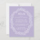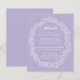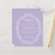Ett budgetbröllopsdetaljkort med texten innesluten i en ungefär oval blommig ram, en blomsterkrans. Titelinformationen är skriven i skrivstil, resten i versaler. Texten och den blommiga ramen är vita, bakgrunden lavendel (ljuslila).