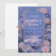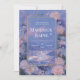 Denna fantastiska bröllopsinbjudan är mycket magisk, drömlik och överdådig och fångar ett surrealistiskt fantasilandskap vid skymning eller gryning. Den centrala fokus ligger på en hisnande utsikt över avlägsna berg och en skimrande iriserande flod eller dal av ljus, allt under en fängslande himmel med mjuka rosa moln och spridda stjärnor. De dominerande färgerna är harmoniska nyanser av lavendel, blekblått, roséguld och persika. Hela scenen är rikligt inramad av en utsmyckad, utsirad rektangulär förgylld metallram, ytterligare insvept i frodiga, dimensionella blomsterkluster. Dessa arrangemang har stora, mjuka rosa peonblommor, isblå kristallblommor och skimrande roségulda blad, vilket skapar en verkligt förtrollande ram. Det övergripande temat är ett majestätiskt himmelskt drömlandschap eller en lyxig vintersagostorhet, perfekt för en stor kvällsmottagning, ett vinterbröllop eller en mycket sofistikerad, fantasitystig galafest. Denna utsökta brevpapper är också väl lämpad för en formell årsdags