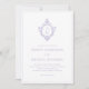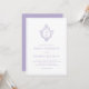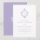 Denna eleganta lila och vita bröllopsinbjudan med vintagekänsla har en gammalmodig blomsterutsmyckad vapensköld med monogram, bestående av brudens och brudgummens initialer, åtskilda av en linje. Ordet "and" är skrivet med elegant kalligrafi, resten med versaler. All text kan anpassas. Vapenskölden och texten är lila, bakgrunden är vit.