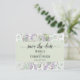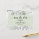 Det här vackra vykortet är designat för att ge dina vänner och familj ett förvarning om ditt kommande bröllop. Det har en vacker rustik vattenfärgdesign med spetsig, kalligrafisk text som lyder "spara datumet" samt parets namn och bröllopsdatum på en ljus, grönaktig ram omgiven av en mängd eucalyptusblad och lavendelkvistar. Baksidan har en söt "skriv in oss med blyerts"-grafik samt plats för en webbplats och annan information.