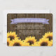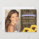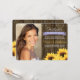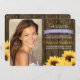 Lägg till ditt favoritfoto från studentexamen i dessa solros-fyllda examensannonser och inbjudningar med en lantlig vintage-charm. Solrosor i guldgul penseldrag omger denna inbjudan till nyutexaminerade med en brun trästaketbakgrund med spikhuvudslister som påminner om gamla lador, en bondgård eller tunna. Lägg till ditt avgångsklass år på det ljusa, blekt lila lavendelfärgade bandet med utseende som ett tryckt band. Detaljer om examensceremonin och festligheterna kan läggas till baksidan av inbjudan. Design © Chrissy H. Studios, LLC. Med ensamrätt.