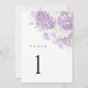 Lavendel lila och vit akvarell hortensia bordsnummer designad för en elegant, sammanhängande bröllopsmottagning. Mjuk blomsterkonst i kombination med en ren modern klassisk layout skapar en förfinad bordssättning som passar vackert med romantiska, trädgårds- och eleganta bröllopsstilar. Perfekt för planerare som söker en polerad, välkoordinerad mottagningslook.