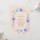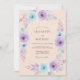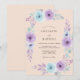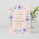 En delikat komposition av blommande blommor i mjuka lavendel- och isblå nyanser pryder en varm persikorosa bakgrund och inger en känsla av eterisk romantik. Frodig lövverk i dämpad grön ton kompletterar de mjuka kronbladstexturerna och skapar en öm och förtrollande atmosfär för din speciella dag.