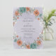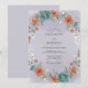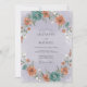 Denna förtrollande design har en målerisk arrangemang av frodiga, mjuktonade blommor och delikat lövverk. En vacker, konstnärlig krans av koralltonade blommor och tealfärgade blomster pryder periferin och skapar en romantisk och fantasifull atmosfär för din speciella dag.