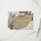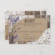 Blå lavendelblommor med vitt rusett över linnebakgrund och åldrade träplankor rustic country western bröllop svarskort design.