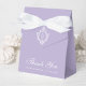 En elegant lavendelfärgad presentask för bröllop. På klaffen finns en vapensköld med ett monogram i, bestående av 2 initialer.