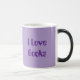 This Morphing Mug displays the words I Love Books. The I Love Books text is on both sides of the mug in purple text. The background of the mug is a lavender color. This mug is a Book Lovers Mug. The morphing mug shows the I Love books purple text and lavender background when you put a hot drink in the mug. The image is on both sides of the mug. This mug is an eleven ounce mug with 3.2” D x 3.8” H dimensions. This mug is made with strong ceramic construction. The mug meets the FDA requirements for food and beverage safety.